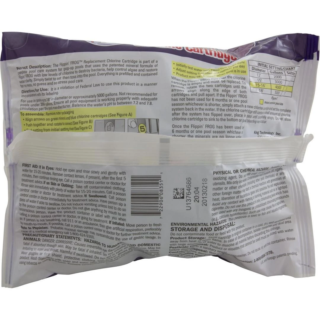 If your King Technology Flippin’ FROG has flipped, it’s time for a new replacement chlorine cartridge. This replacement chlorine cartridge fits on the Flippin’ FROG soft-sided pool sanitizer. The Flippin’ FROG is suitable for pools up to 5,000 gallons and dispenses chlorine from two to four weeks. This chlorine sanitizer cartridge kills harmful bacteria using half the normal amount of chlorine. This sanitizer gives you less work to do without the daily dosing of a regular sanitizer.