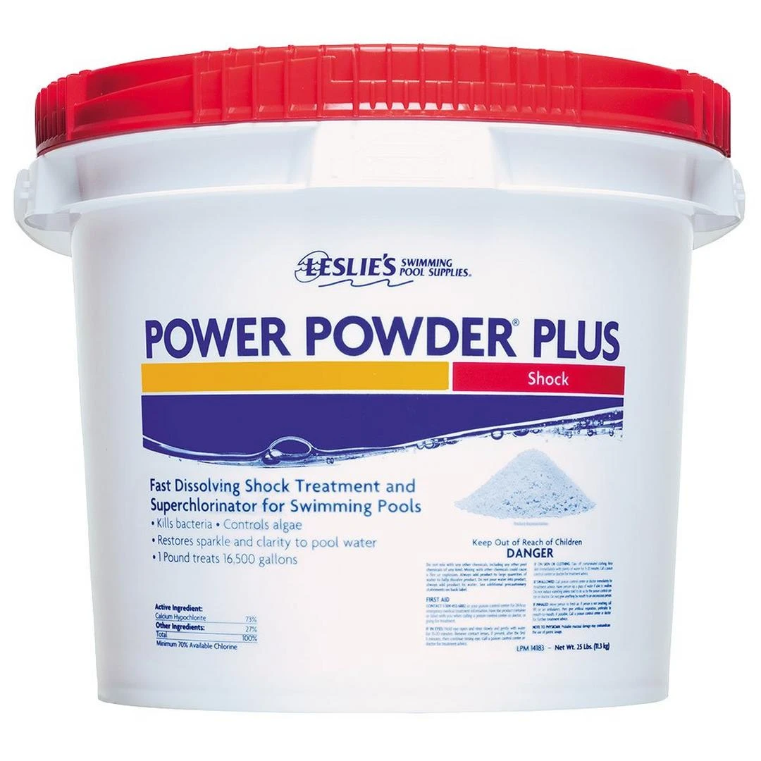 Leslie’s Power Powder Plus Pool Shock has the highest percentage of Calcium Hypochlorite available for a super strength and concentrated pool shock. Some other pool shocks have a lower percentage of active ingredient with a higher percentage of inert ingredients which reduce the amount of chlorine sanitizer that is ultimately added to your pool.