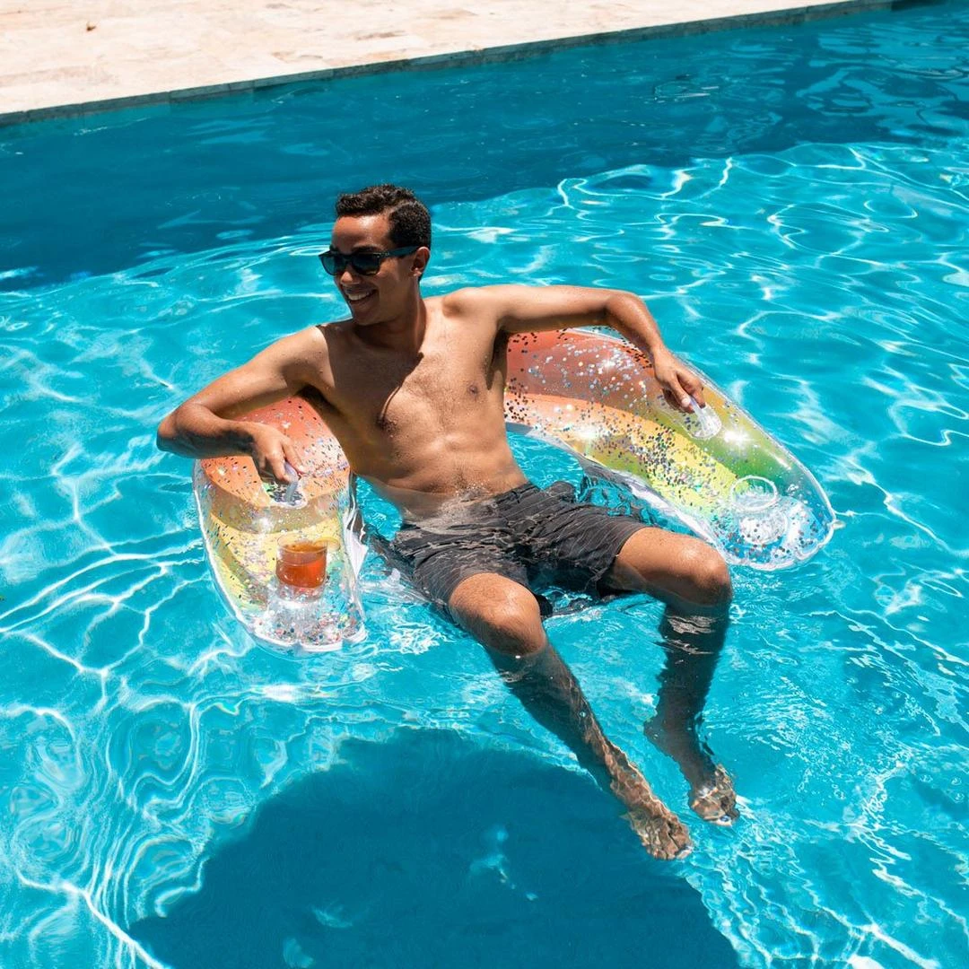 This Rainbow Collection Party Pack includes a Deluxe Sun Chair float and a Jumbo Pool Noodle. Both are filled with holographic glitter that changes color in the sun, and highlights the beautiful ombre rainbow print inside. Fill your pool with all the colors of the rainbow!