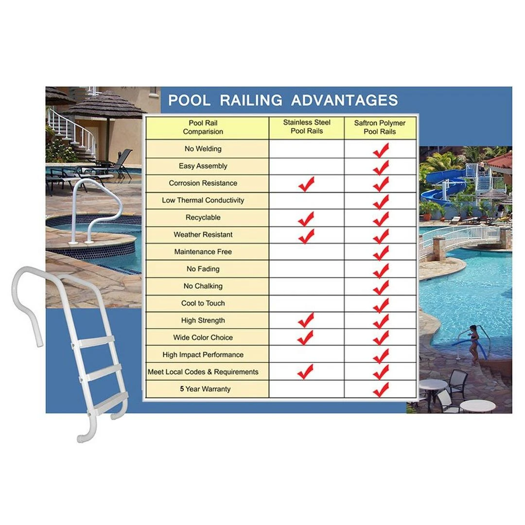 54″ Return to Deck CrosThe Saftron Return to Deck Cross Braced 3 Bend Hand Rail is constructed of high impact polymer exterior to resist the elements. The high impact polymer exterior helps with the maintenance of the product being unaffected by pool chemicals, the sun, and keeps them cool to the touch. The strength of Saftron’s crossed braced railings comes from the reinforced interior of encapsulated aluminum. The interior strength and exterior durability of these Saftron railings make it a perfect fit for your commercial pool. These Saftron products require no grounding or bonding.s Braced 3 Bend Hand/Grab Rail, White